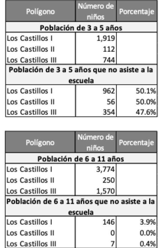 Respecto a Los Castillos en concreto, encontramos los siguientes datos: La población que no asiste a la escuela entre 3 a 5 años es del 48.1%, de 6 a 11 años es de 3.1%, de 12 a 14 años es de 9.5%, de 15 a 17 es de 38.7%.